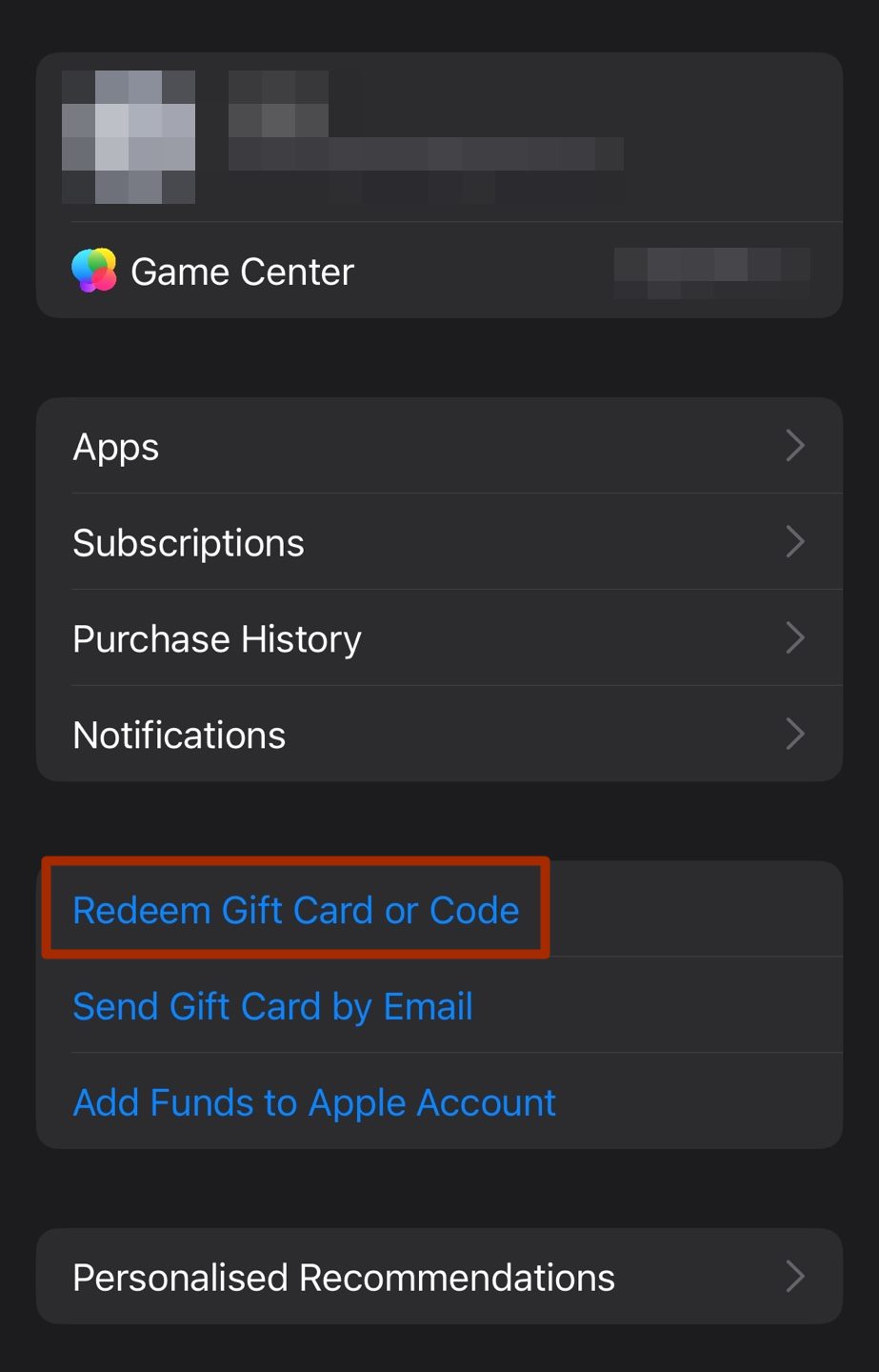 오른쪽 상단 프로필 아이콘 → 'Redeem Gift Card or Code' → 'You can also enter your code manually'