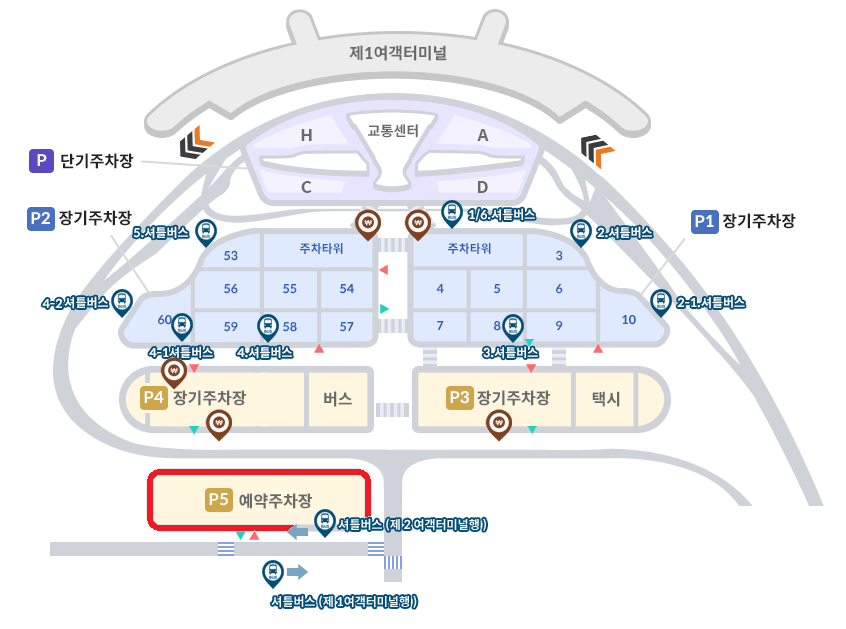 그리고 가장 터미널에서 가장 멀리 떨어진 P5가 예약 장기주차장입니다. 거리가 꽤 있어서 많은 분들이 터미널 앞에 짐과 일행을 내려주고 운전자만 주차 후에 공항 카운터로 오는 방식으로 하더라고요.